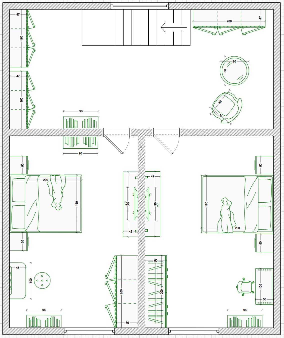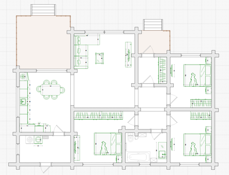 четыре спальни, кухня-гостиная, два санузла, гардероб.