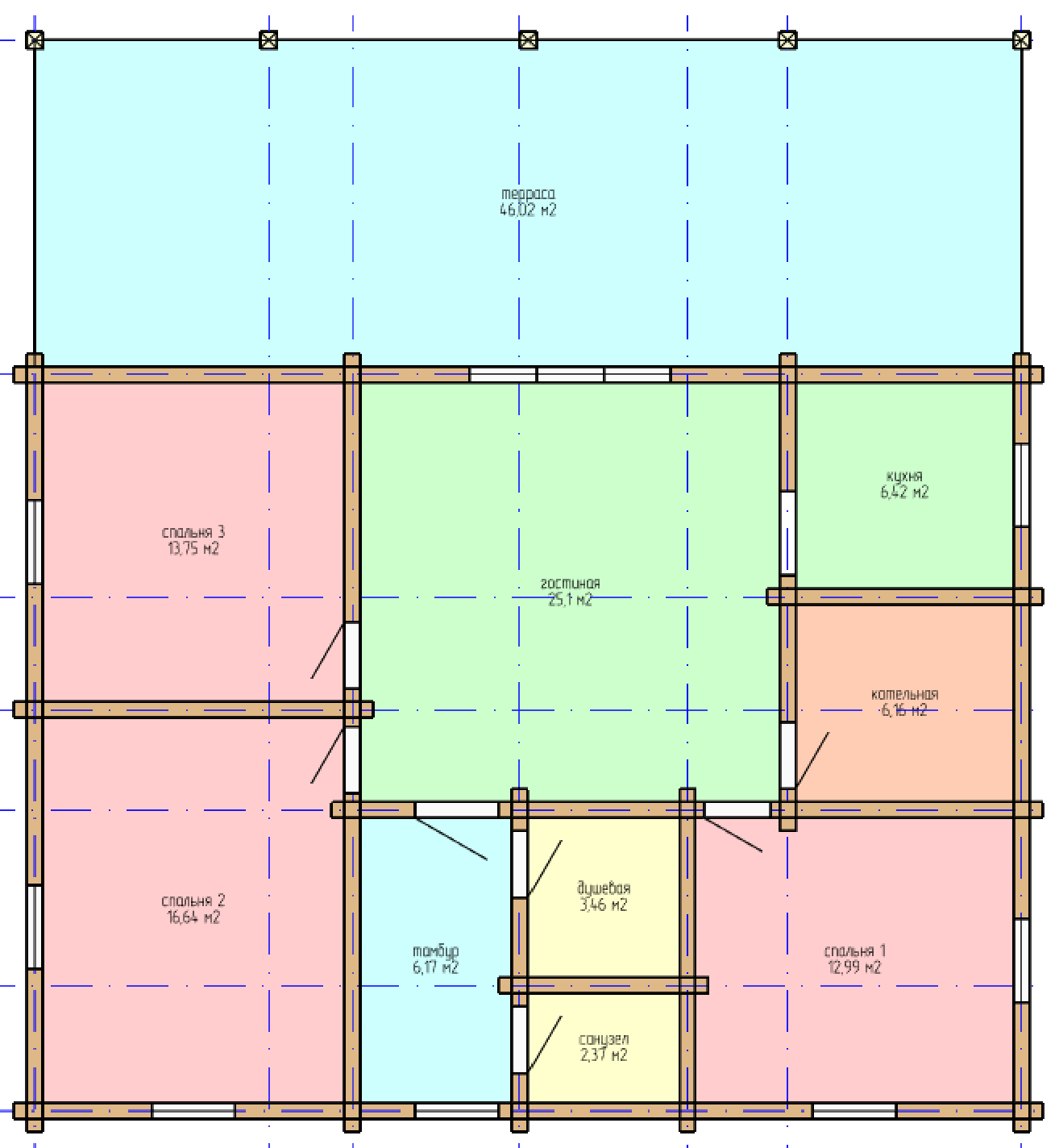 терраса, кухня-гостиная, три спальни, один санузел, котельная